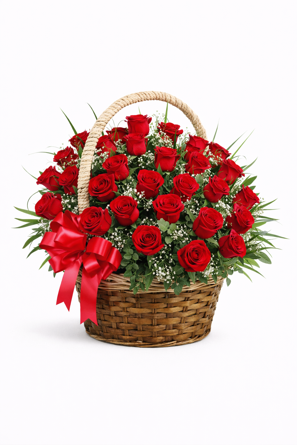 The basket includes 24 premium quality national roses and greenery, all carefully arranged in a beautifully decorated basket. This combination of roses and greenery creates a visually appealing and harmonious display.