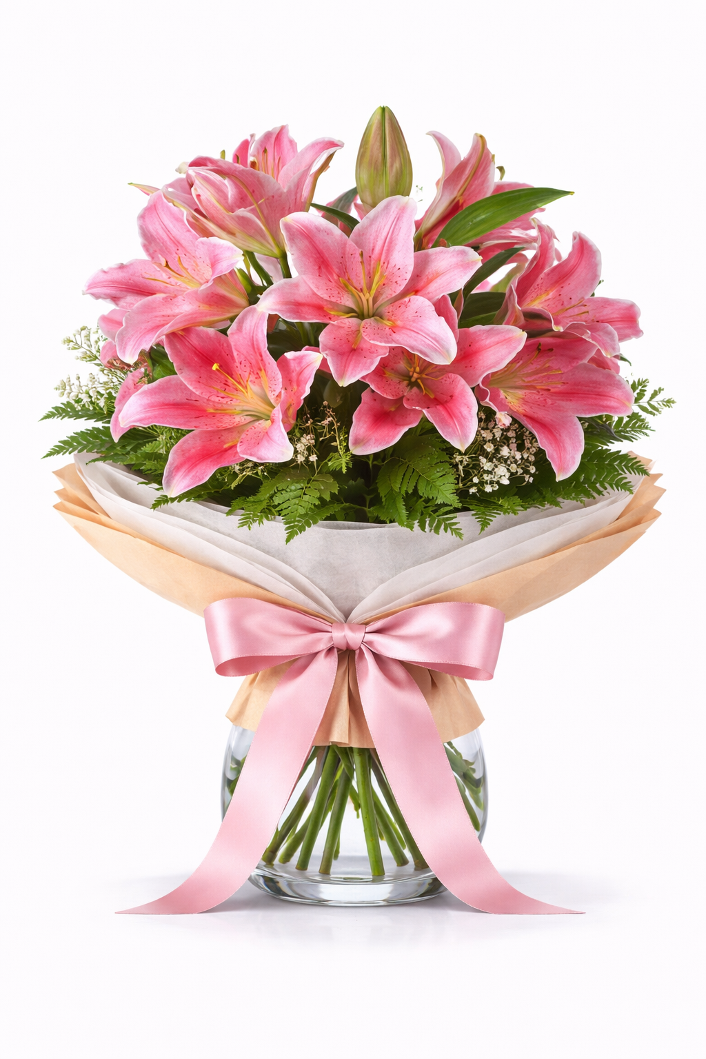Arreglo de liliuns de color rosa y follaje en jarrón de cristal. Ideal para cualquier ocasión y si lo deseas, acompáñalo con cualquiera de nuestros productos adicionales en la próxima etapa de la compra.
