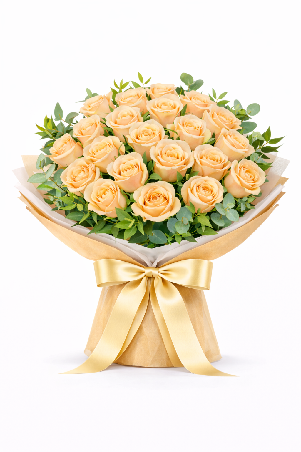 Este buquê de 24 rosas na cor champagne exala serenidade e elegância.
