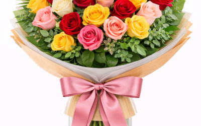 Uma linda explosão de amor e cores nesta combinação de 12 rosas cor-de-rosa, 12 rosas vermelhas, 12 rosas brancas e folhagens em um vaso de vidro.