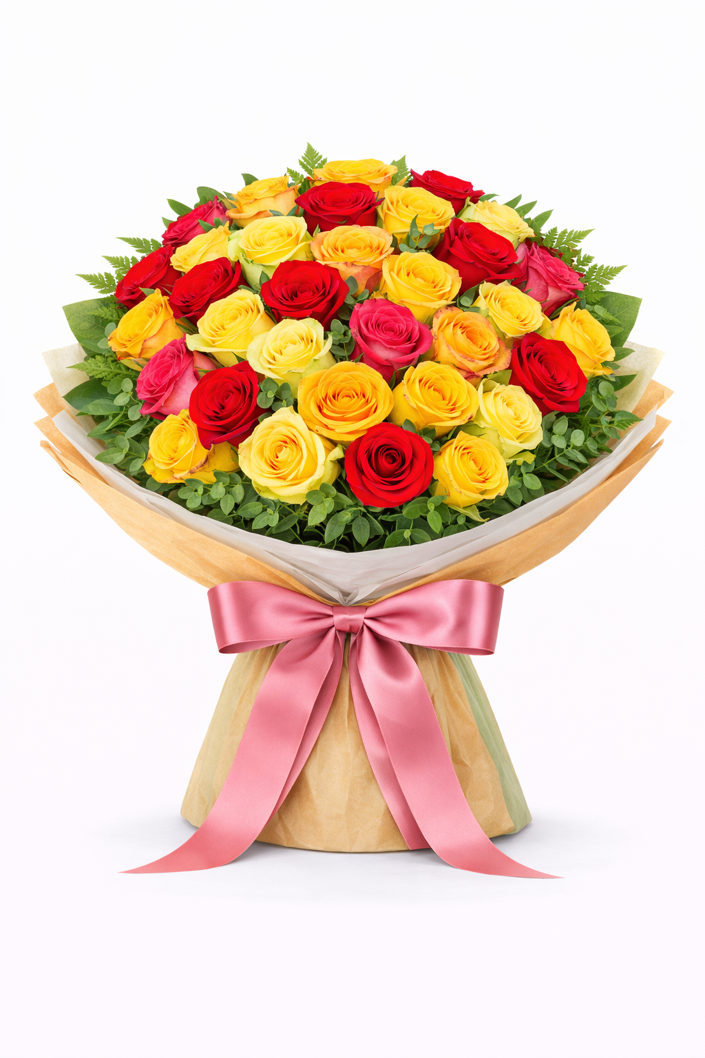 Maravilhoso buquê de 36 rosas nacionais de cores mistas. Embalagem em papel celofane e bonito acabamento com laço. No próximo passo você poderá deixar o seu presente ainda mais especial adicionando um vaso, chocolates ou outras opções.