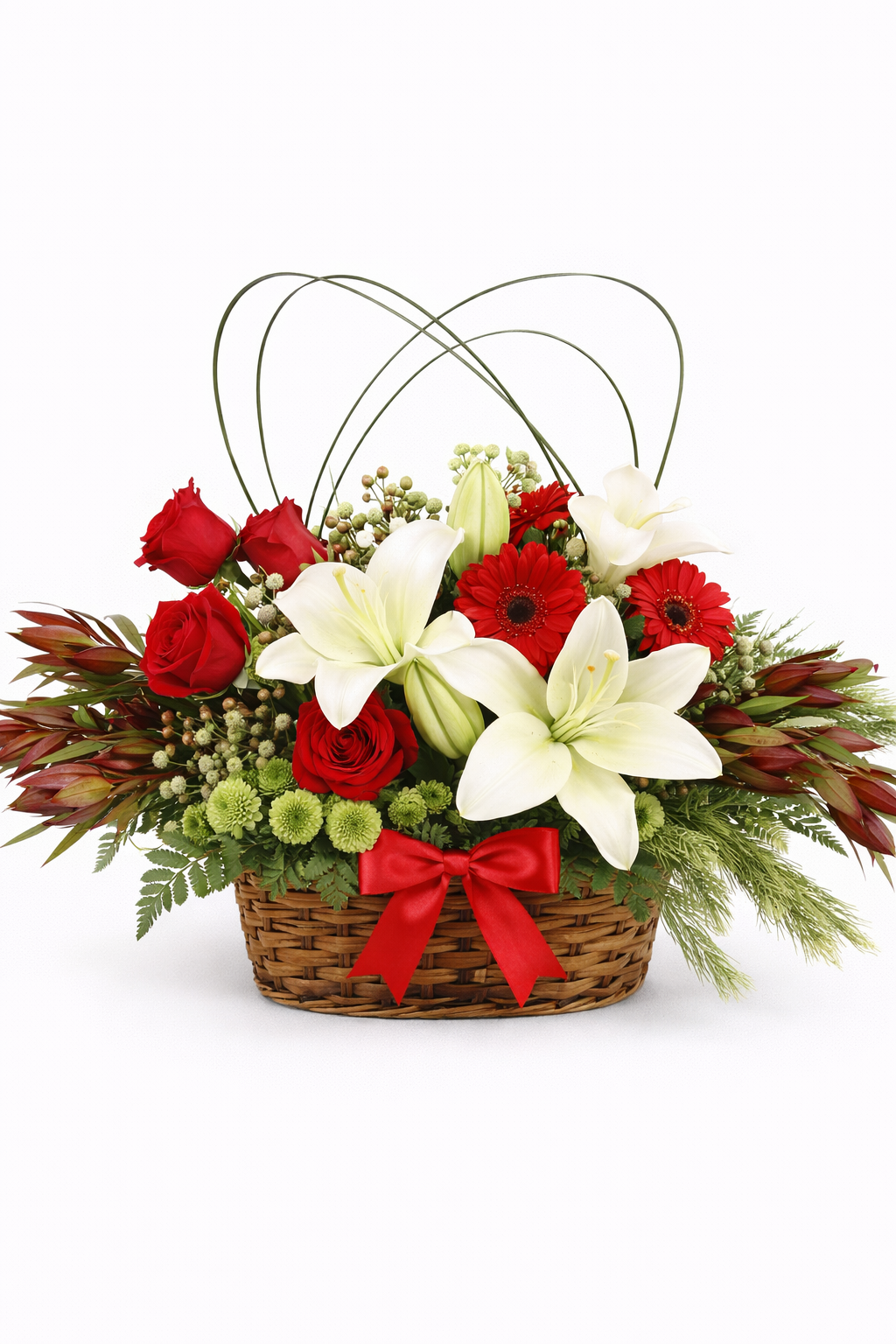 Este centro de flores inclui uma combinação exuberante de lírios brancos, gerberas vibrantes e rosas vermelhas, harmonizados com folhagens verdes que adicionam um toque especial à decoração natalina.