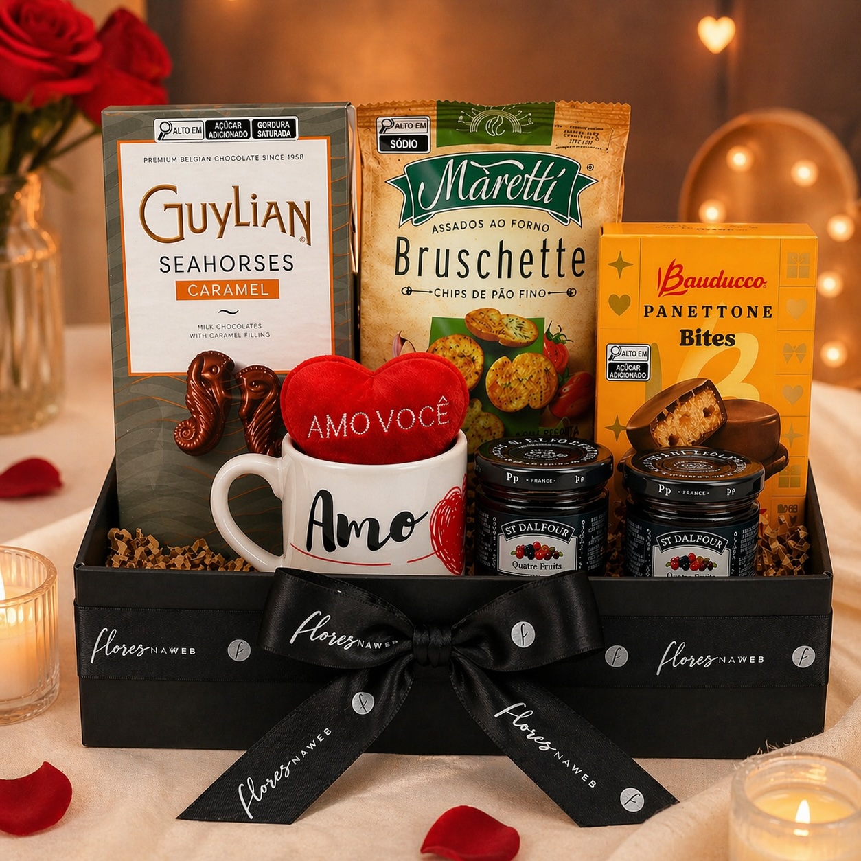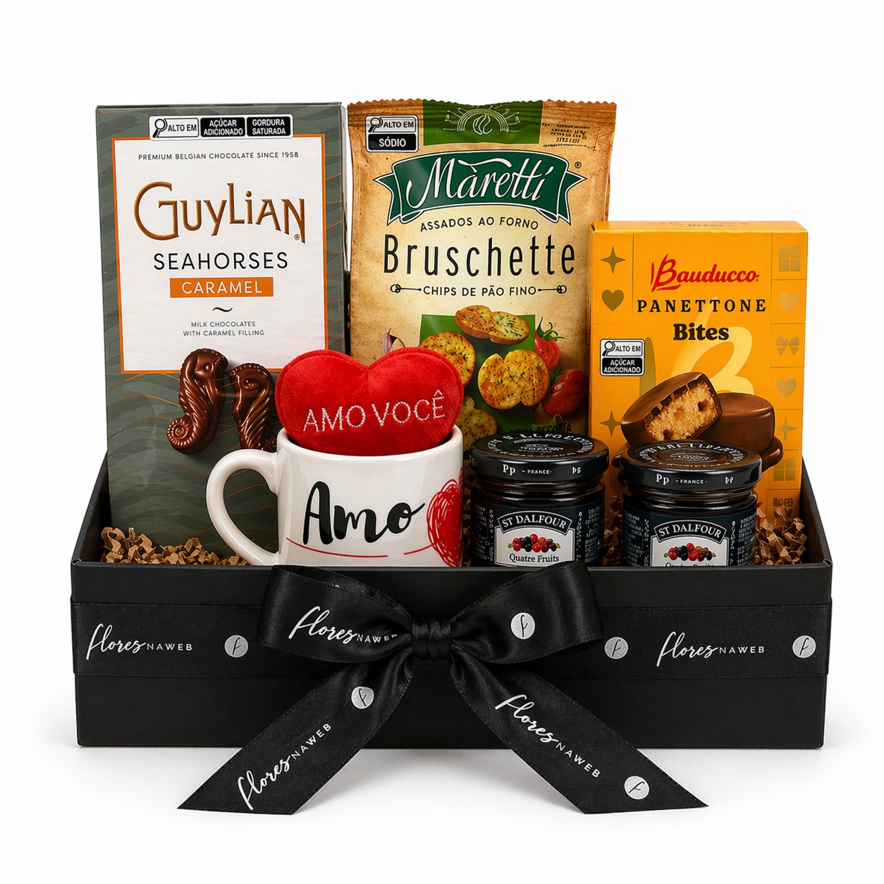 A cesta inclui ainda uma charmosa xícara personalizada “Amo”, acompanhada de uma pelúcia em formato de coração com a mensagem “Amo você”, criando um presente cheio de significado. Para finalizar, duas geleias francesas premium St. Dalfour (28g cada) completam essa experiência gourmet.